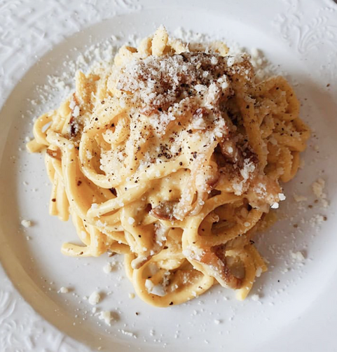 Wine cream, smoked bacon, chives, garlic, black pepper, soft egg, parmesan.